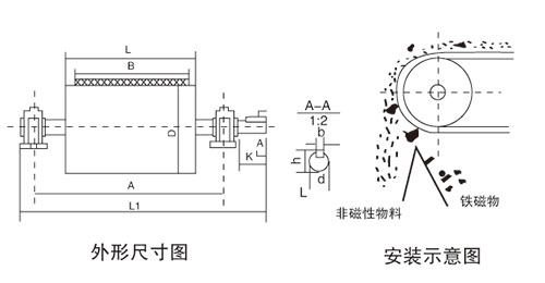 | 型號 | 筒表磁場強度Gs | 皮帶速度≤m/s | 物料厚度≤mm | 重量kg | 外形尺寸mm | ||||||||